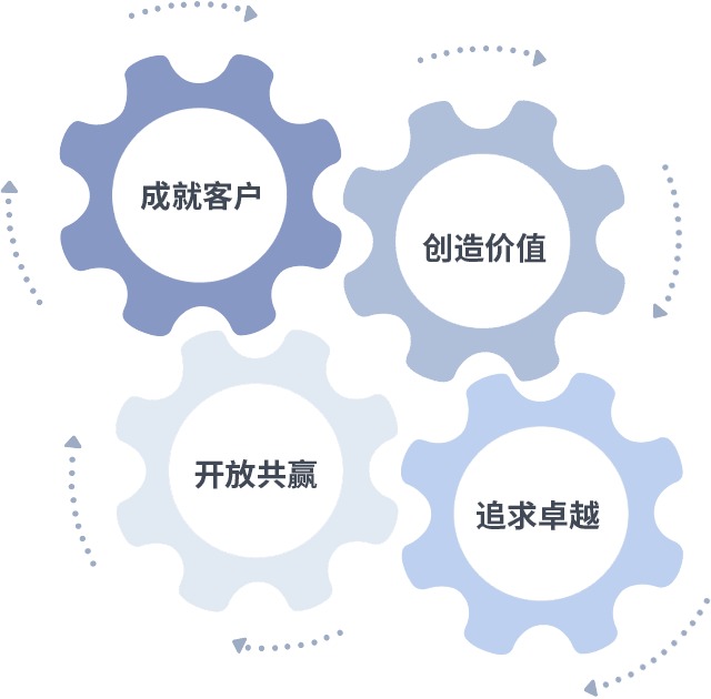 成就客户是一切决策的出发点,,,创造价值是衡量所有工作的标准,,,,追求卓越是我们做事做人的态度,,,,开放共赢是我们的格局也是最终的结果。。。。价值观的齿轮环环相扣,,,推动着组织里的每个人不断向前。。。。